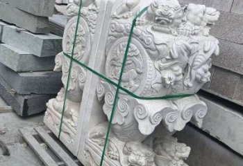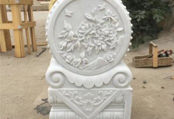 這是一尊漢白玉石雕門墩景觀雕塑,主體為門墩造型,墩身雕刻牡丹等紋飾,上方立著馱有精美花紋的大象,工藝精湛,寓意吉祥。